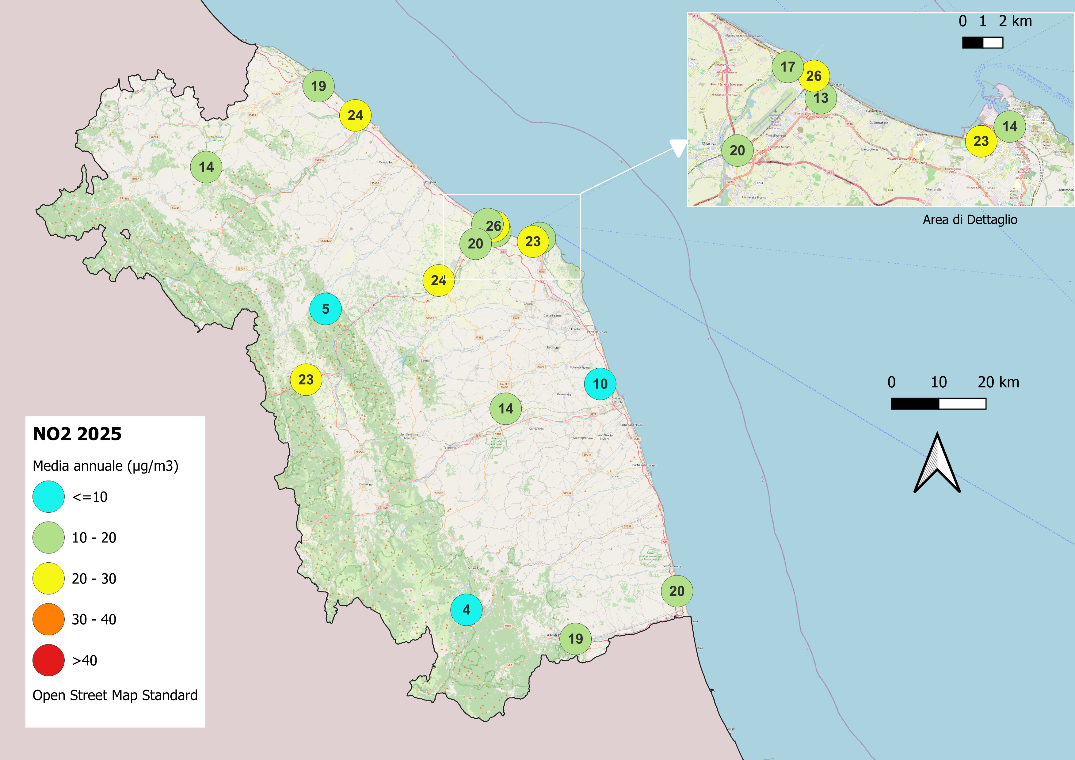 | Le norme in vigore fissano il valore limite annuale in 40 µg/m3: nel 2025 nessuna stazione ha superato tale limite. |