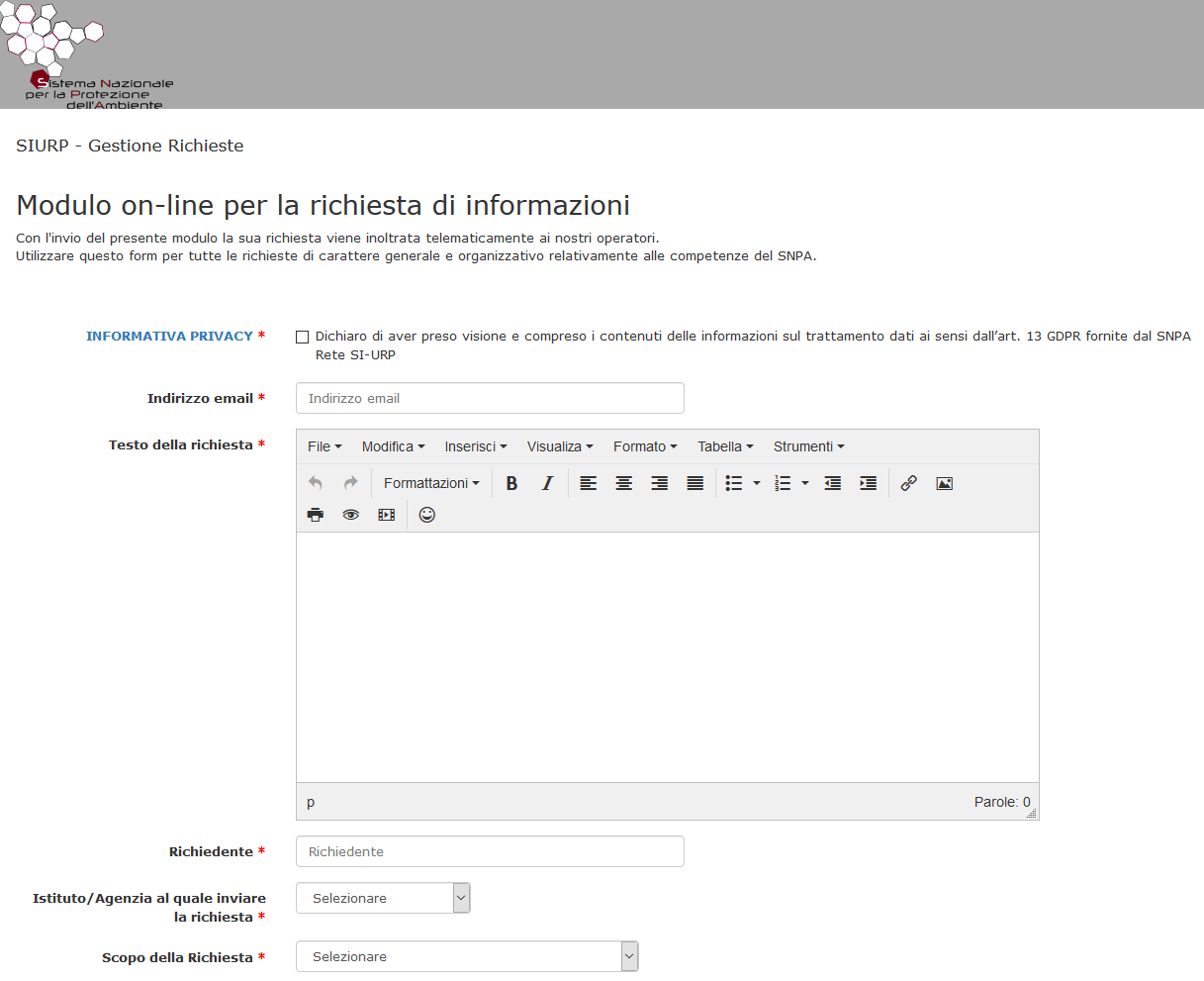 È inoltre disponibile il NUOVO SERVIZIO per la presentazione telematica di richieste di ACCESSO AGLI ATTI (Legge 241/1990), ACCESSO CIVICO SEMPLICE E GENERALIZZATO (d.lgs. 33/2013) e ACCESSO ALLE INFORMAZIONI AMBIENTALI (d. lgs. 195/2005), cui è possibile accedere - selezionando "ARPA Marche" nel campo "Ente destinatario della richiesta" e avendo cura di compilare le 5 brevi schede proposte (Destinatario, Richiedente, Documento, Recapiti e Richiesta) - utilizzando il seguente