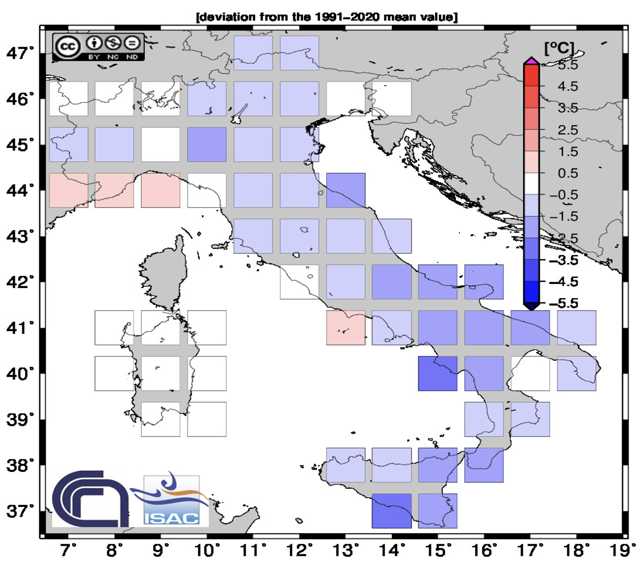 Dal mese di aprile, e ancor più da quello di maggio, piogge, temporali e grandinate hanno dominato in gran parte dell’Italia; a livello europeo un costante anticiclone si è spinto verso il Regno Unito e la Scandinavia, generando temperature sopra la media (oltre 30°C in Spagna, Francia occidentale, ma anche a Londra), mentre il settore centrale del Mediterraneo è stato interessato da temperature generalmente in media nei valori minimi, ma diffusamente sotto media in quelli massimi (Figura 2).