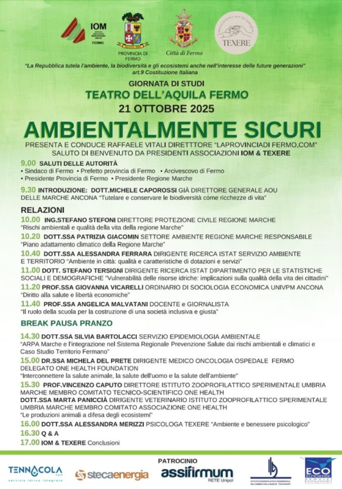 Con il titolo “AMBIENTALMENTE SICURI” si è recentemente tenuta al Teatro dell’Aquila di Fermo una giornata di studi, organizzata dall’Istituto Oncologico Marchigiano Onlus, Provincia di Fermo, Città di Fermo e Associazione Texere, finalizzata a coinvolgere gli studenti degli istituti superiori della regione sul tema della cura dell’ambiente, rendendoli consapevoli di quanto la nostra salute e sicurezza siano legate al benessere del pianeta (Leggi il programma della giornata).